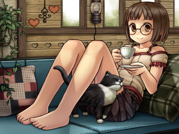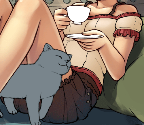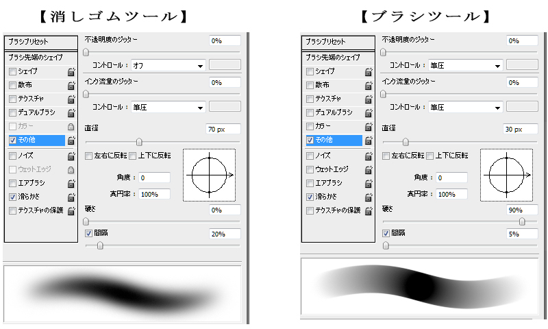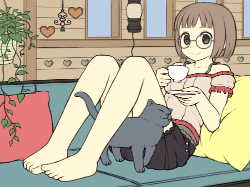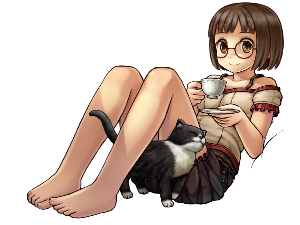 使用ソフト / Photoshop CS3 ■ 消しゴムツールとブラシツールを使います。設定は下のようになっています。ツールはほぼ これしか使いません。マスク塗りをするので消しゴムはブラシ、ブラシは消しゴムとしても機能 するようになります。硬いタッチはブラシ、柔らかいタッチは消しゴムで出していきます。 ■ 最初にパーツごとに色分けします。終わったら各部を塗り込む前に乗算やスクリーンなどを 使って完成イメージを作成します。ランプを光らせると綺麗なので夜も捨てがたかったのですが 今回はティータイムということでお昼に決定ヽ(*^^*)ノ ■ それでは塗っていきます。僕はいつも髪から塗ります。髪の毛で塗りの方向性を決めます。 薄い影→濃い影→照り返しの順番に色を重ねます。 ■ 次に表情を塗ります。瞳は線画をそのまま質感として利用できるように描いておいたので上から 濃い影を落とし、下を照らし、ハイライトを入れてサクッと塗り終わりました。 白目は薄いグラデーションを落とし、まぶたの下に濃い影を入れると眼球の球体感が出ると思います。 眉とまつげが薄かったので下に色を置き、線画に色をつけます。 ■ 次は肌を塗ります。グラデーション→影→グラデーション→影を繰り返して満足したら照り返しを入れます。 ■ 服も同じくグラデーションから始めてシワ、またグラデーション、最後に照り返しとラインなどを入れます。 ■ ティーカップを塗ります。グラデーションで立体感を出し、影をつけてハイライトと模様を入れます。 ■ 猫を塗ります。毛色を分けてざっと立体感を出し、毛並みを描いて最後に明るい色を置いて とりあえず完成です。描き慣れてないので難しい・・・。 ■ キャラが塗り終わりました! 未完成の背景と一緒に見るとまだまだですが白地で見ると結構いい感じ?
